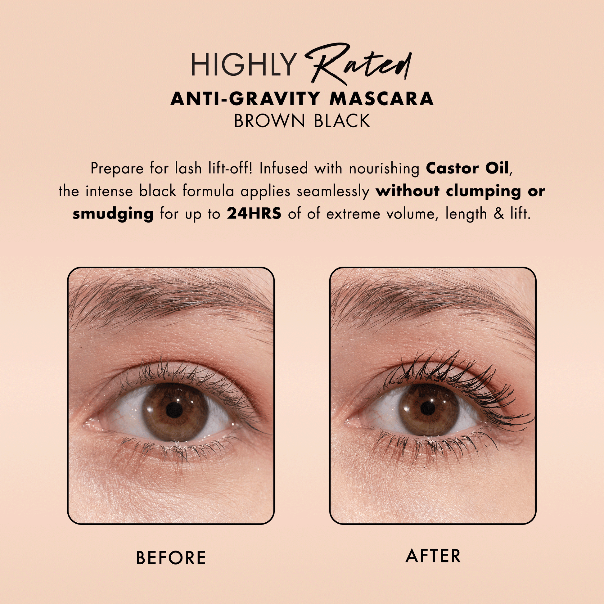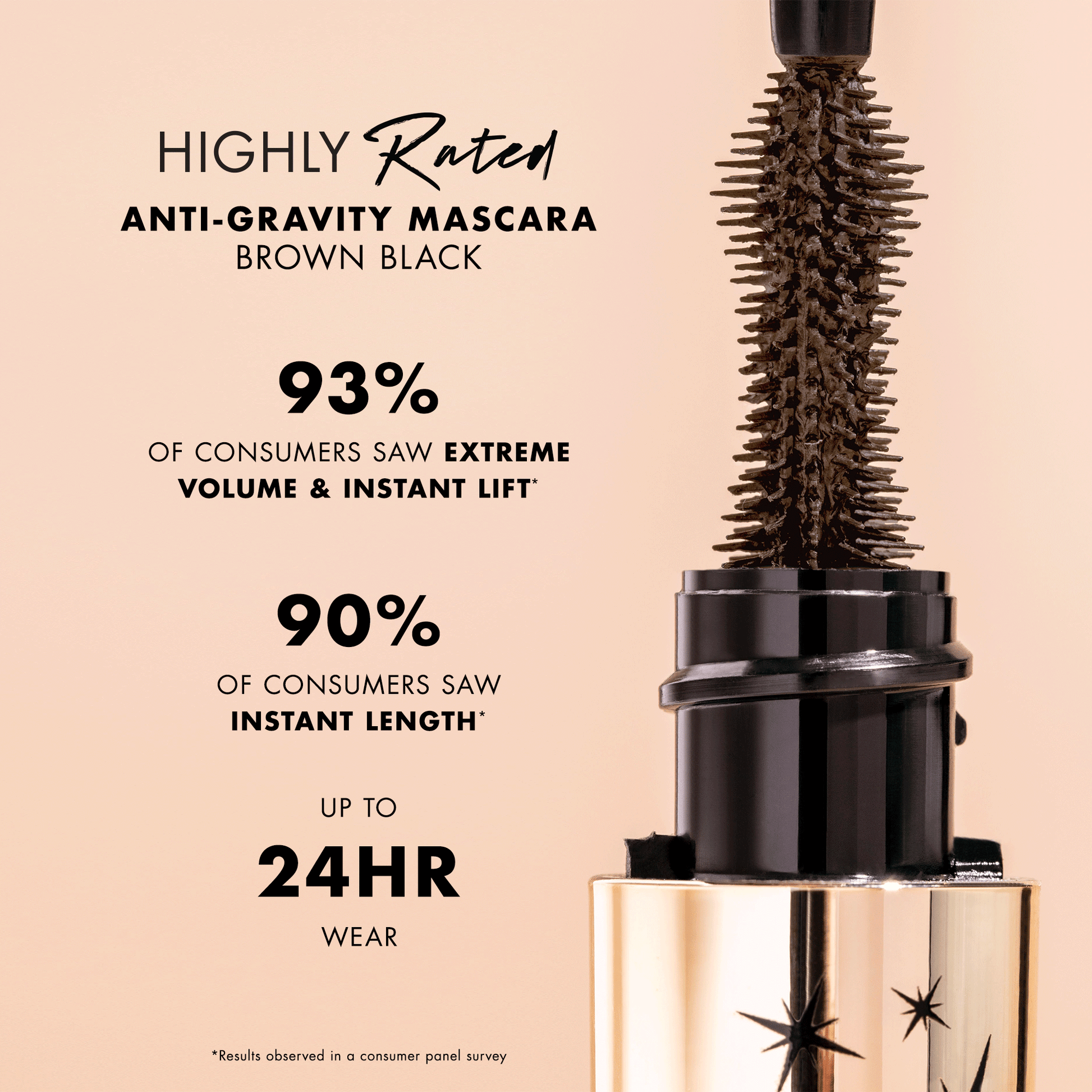 Prepare for lash lift-off! Milani¡¯s Highly Rated Anti-Gravity Mascara instantly delivers extreme volume, length and lift for truly out of this world lashes. Infused with nourishing Castor Oil, the intensely pigmented formula applies seamlessly without clumping or smudging for up to 24 hours of flawless wear. The flexible, molded hourglass shaped brush coats and grabs every lash for maximum impact every time. Now available in shade Brown Black.