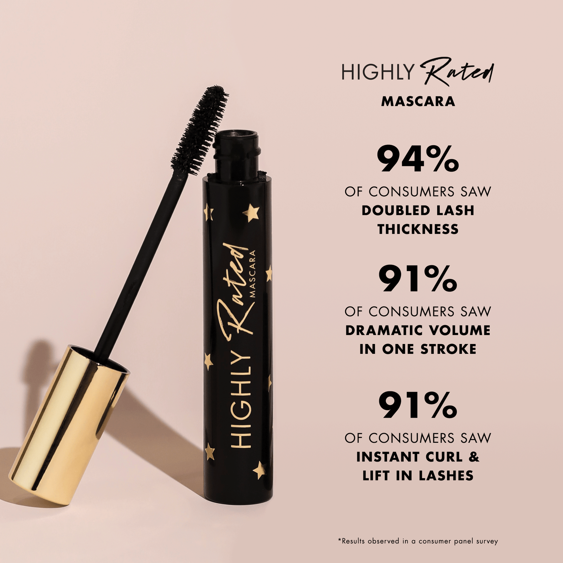 Highly Rated Mascara is highly rated for a reason! Our luxurious mascara builds, lifts and dramatizes for sky-high lashes in a single stroke. Get full coverage for flawless fringe -- this top drugstore mascara will give brilliant color and definition to every last lash. You'll love our brush: The Highly Rated Elite mascara brush is designed to coat lashes from root to tip. The Elite brush has a tapered end that delivers sleek, even saturation, and it combs and separates to volumize and define. Think of it as your magic wand for long lashes. Highly Rated mascara conditions lashes without smudging, flaking or clumping -- so it's perfect for everyday and special occasion looks. Talk about fringe benefits. PROVEN RESULTS:*
