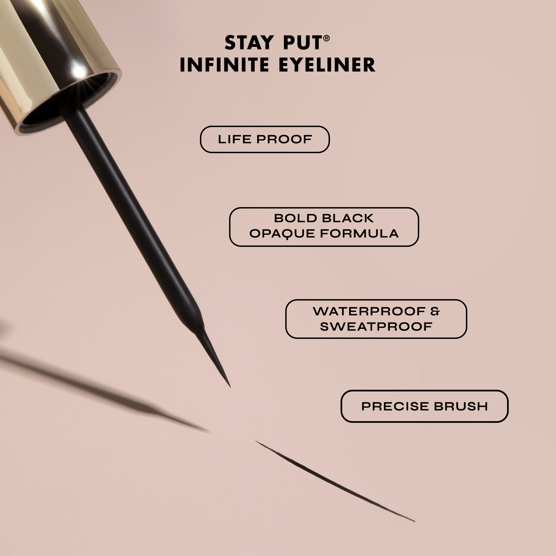 Lifeproof your liner! We heard you¡ªand we brought back the cult classic Stay Put Infinite Liner, but this time it¡¯s better than ever. Meet your forever eyeliner, with a bold black opaque formula and precise brush designed to effortlessly achieve killer sharp lines. This eyeliner is the definition of serious staying power, delivering 24HR wear that's also sweat-proof, waterproof, and totally life-proofed.